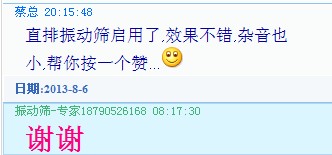 您好,得知您購買我們的ZPS-800型直排篩現(xiàn)已投入到生產(chǎn)中,并且效果很好,雜音也很小,為此向你祝賀。我們大漢公司生產(chǎn)的一系列振動篩,振動振動篩,直排篩,試驗篩,拍擊篩,氣流篩因做工扎實,質(zhì)量可靠而受到廣大客戶的稱贊。
